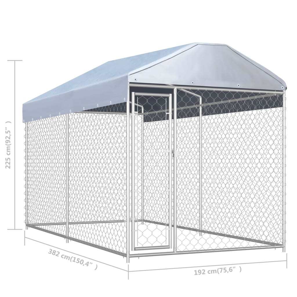 This large dog kennel provides ample exercise space while the chain link mesh all around helps prevent mischief and unexpected accidents, while enabling ventilation. Thanks to the sturdy and heavy-duty galvanized steel construction, this dog kennel is durable and built to last. The included top canopy, made of 100% polyethylene, is fire-resistant and UV protected, providing protection from sun, rain, snow and other weather conditions. The hinged door ensures extra security and safety for your dogs thanks to the lockable latch system. Assembly is easy.Material: Galvanized steel frame & meshOverall dimensions: 150.4" x 75.6" x 88.6" (L x W x H)Inner dimensions: 148" x 73.2" x 84.6" (W x D x H)Door size: 17.7" x 66.9" (W x H)Wire diameter: 0.08"Volume: 607.4 ft³Ground surface area: 78.6 ft²Lockable latch systemChain-link mesh sidewallsEasy to assembleDelivery also includes a canopy topSuitable for dogs