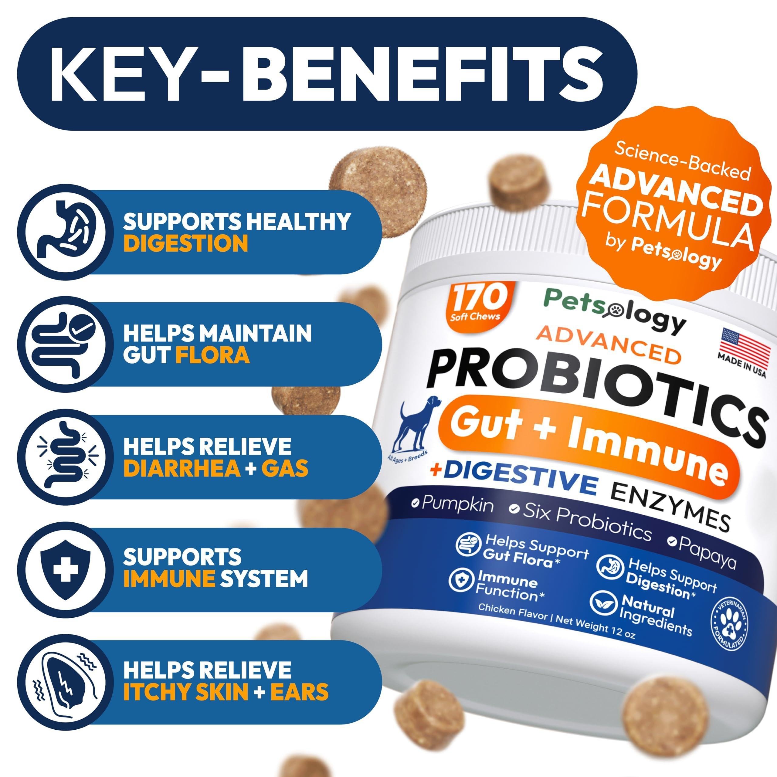 1.supports digestive health & comfort: our dog probiotics for digestive health help maintain a balanced gut microbiome, reducing bloating, gas, and digestive discomfort. dog probiotics for yeast, itchy skin and itchy ears. relieves diarrhea & constipation: formulated with premium pet probiotics for dogs, this supplement supports digestion, firm stools, and gut balance to ease diarrhea, bloating, and constipation. enhances nutrient absorption: packed with digestive enzymes for