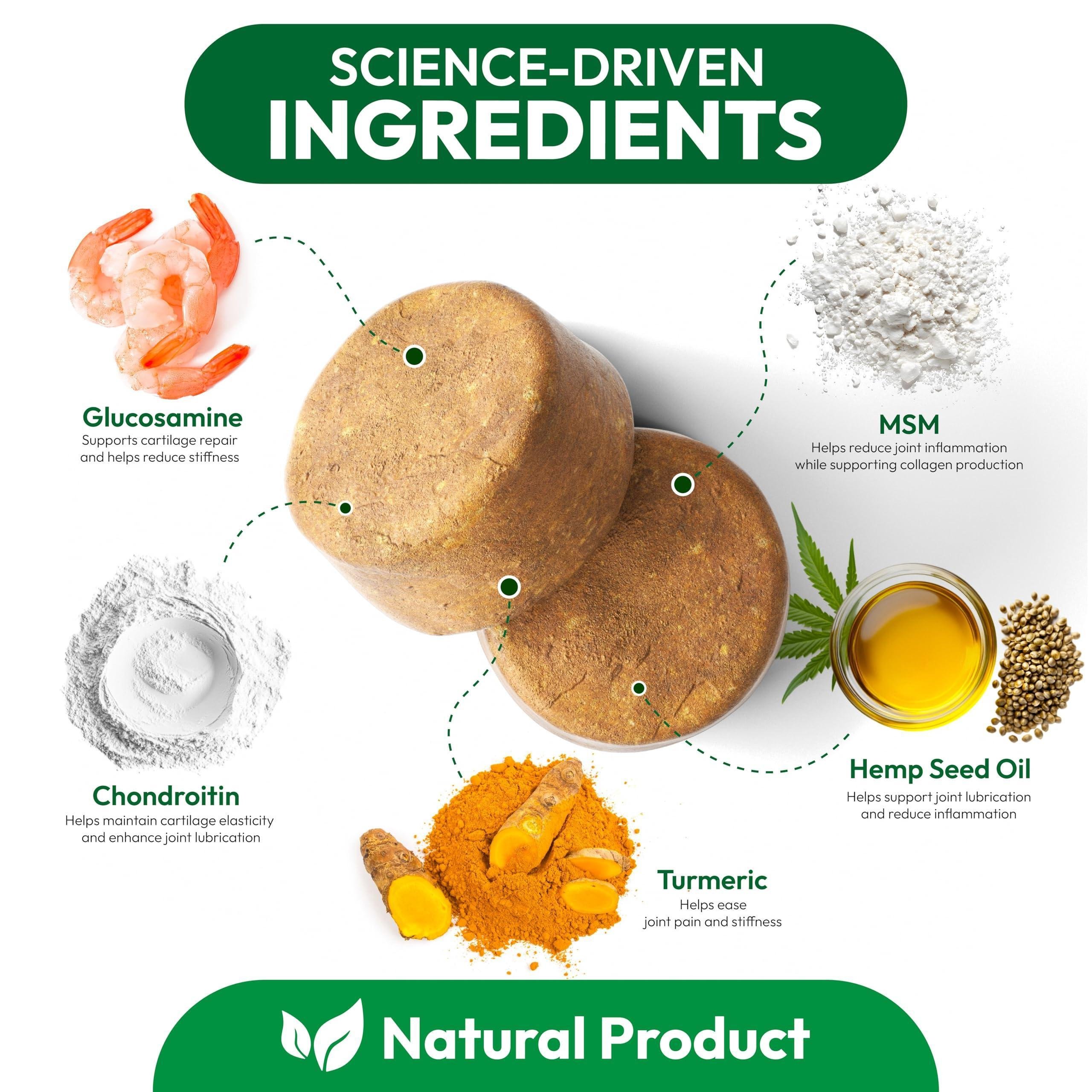 1.supports joint health & mobility: this dog hip and joint supplement helps maintain flexibility, lubricate joints, reduce stiffness, and support long-term mobility for active and aging dogs. help reduce pain: made with glucosamine, chondroitin, msm, and hemp oil, these chews help reduce stiffness, ease discomfort, and support better mobility for dogs of all sizes. perfect for all breeds & sizes: specially designed for both small and dog joint supplement large breed dogs, our